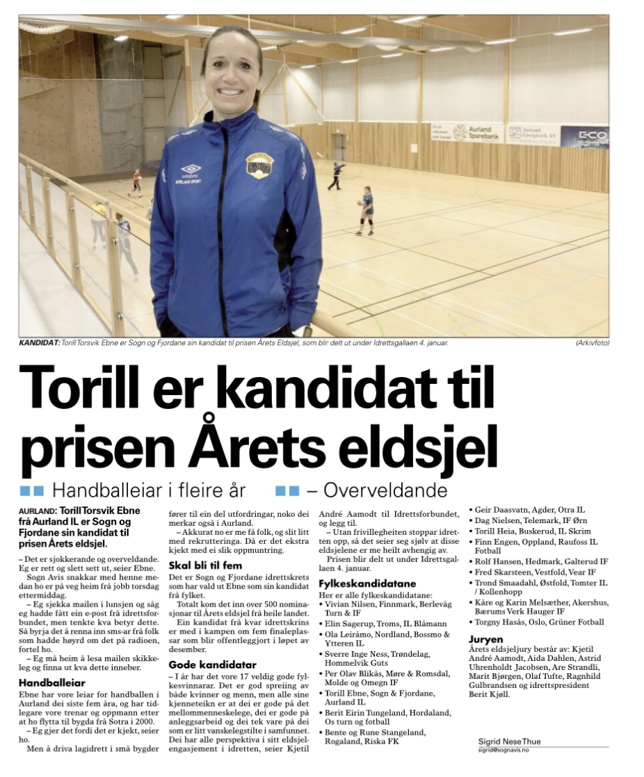 Nominasjonen heng høgt og er svært fortent. Torill Torsvik Ebne har gjort ein kjempejobb for handballgruppa spesielt, og for idretten i Aurland generelt. At idrettskrinsen nominerer henne som Sogn og Fjordane sin kandidat til Årets eldsjel, viser at ho også er lagt merke til på fylkesnivå. Me gratulerer!